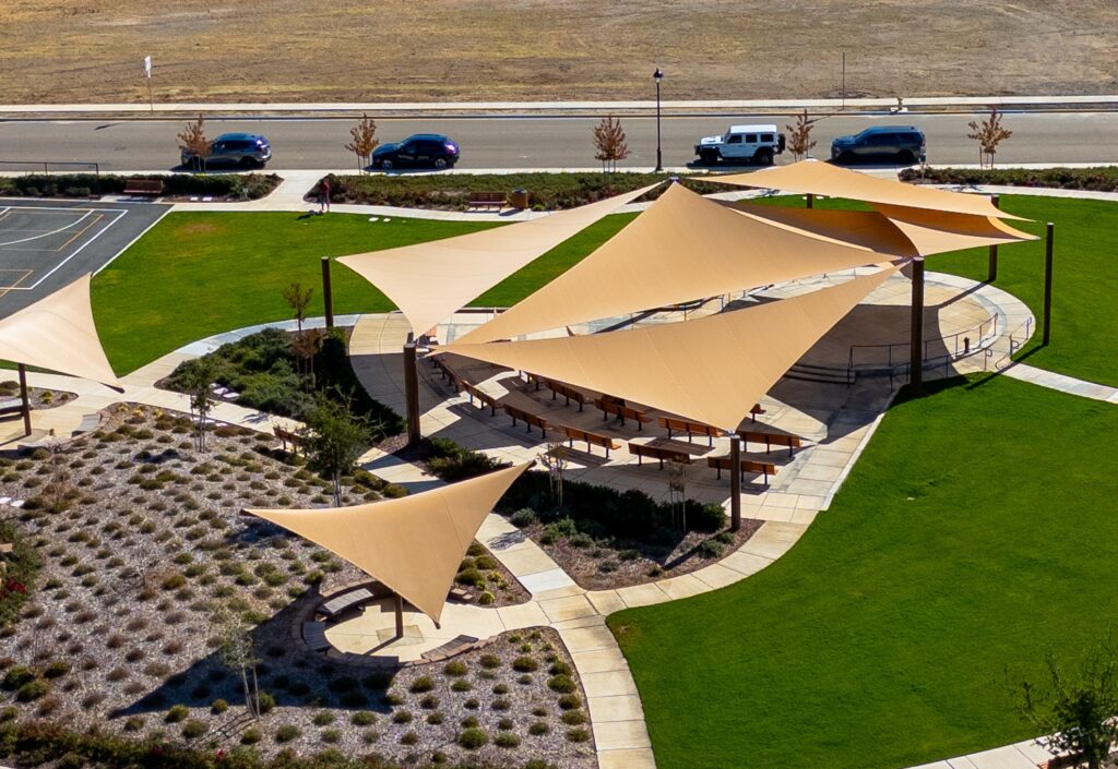 Shade Systems™ is proud to have provided its custom-designed fabric ‘Sail’ shades and two of its Hypar Single Post umbrellas for the City of Brentwood’s Parks and Recreation Commission at Pioneer Park.