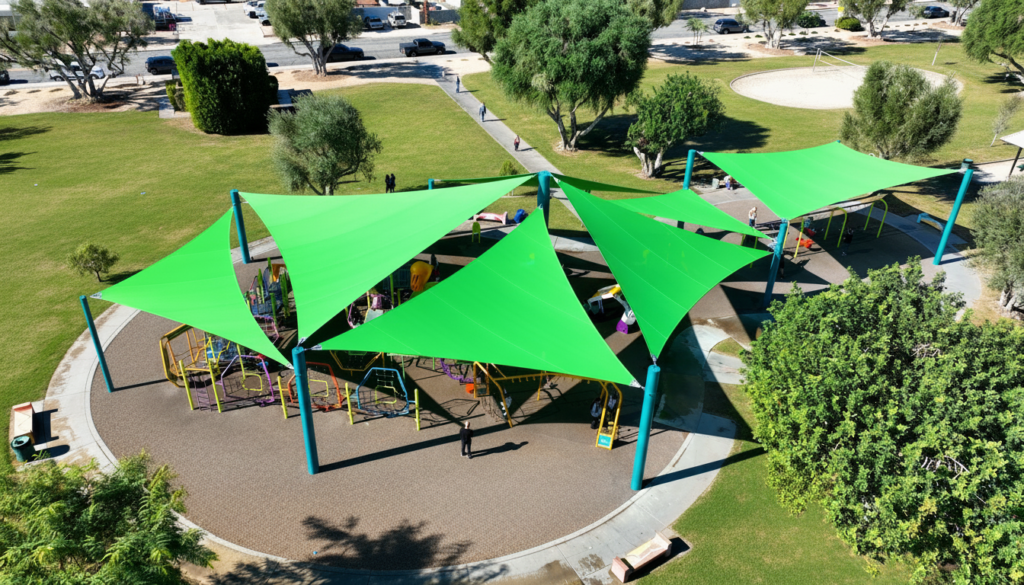 With the help of its California sales reps at Miracle Playground Sales, Shade Systems™ is proud to have provided its custom-designed fabric ‘Sail’ shades for the City of Palm Springs at Victoria Park.